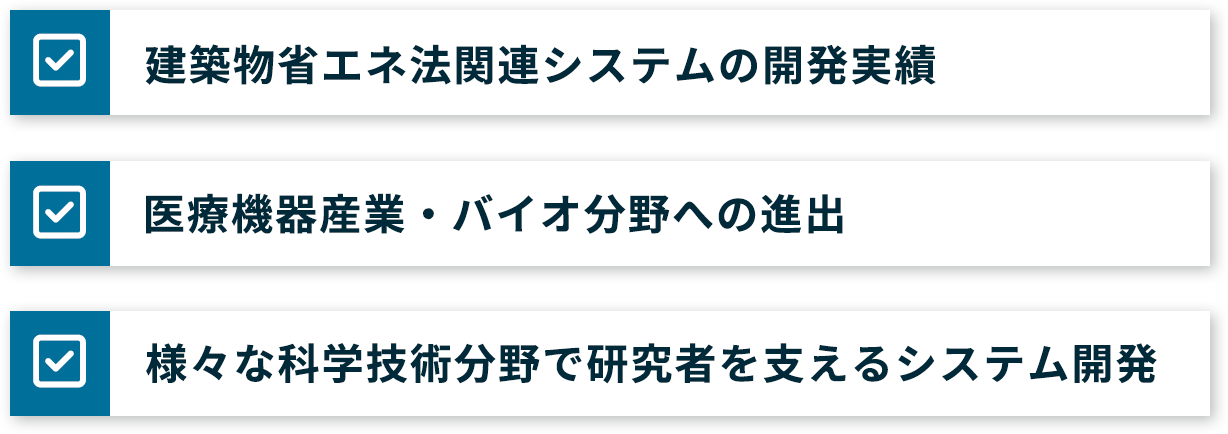 例えば、建築物省エネ法に関連する大規模システム開発や、人々の健康を支える医療機器やバイオ分野のシステム開発など、社会の未来に直結するプロジェクトが中心です。